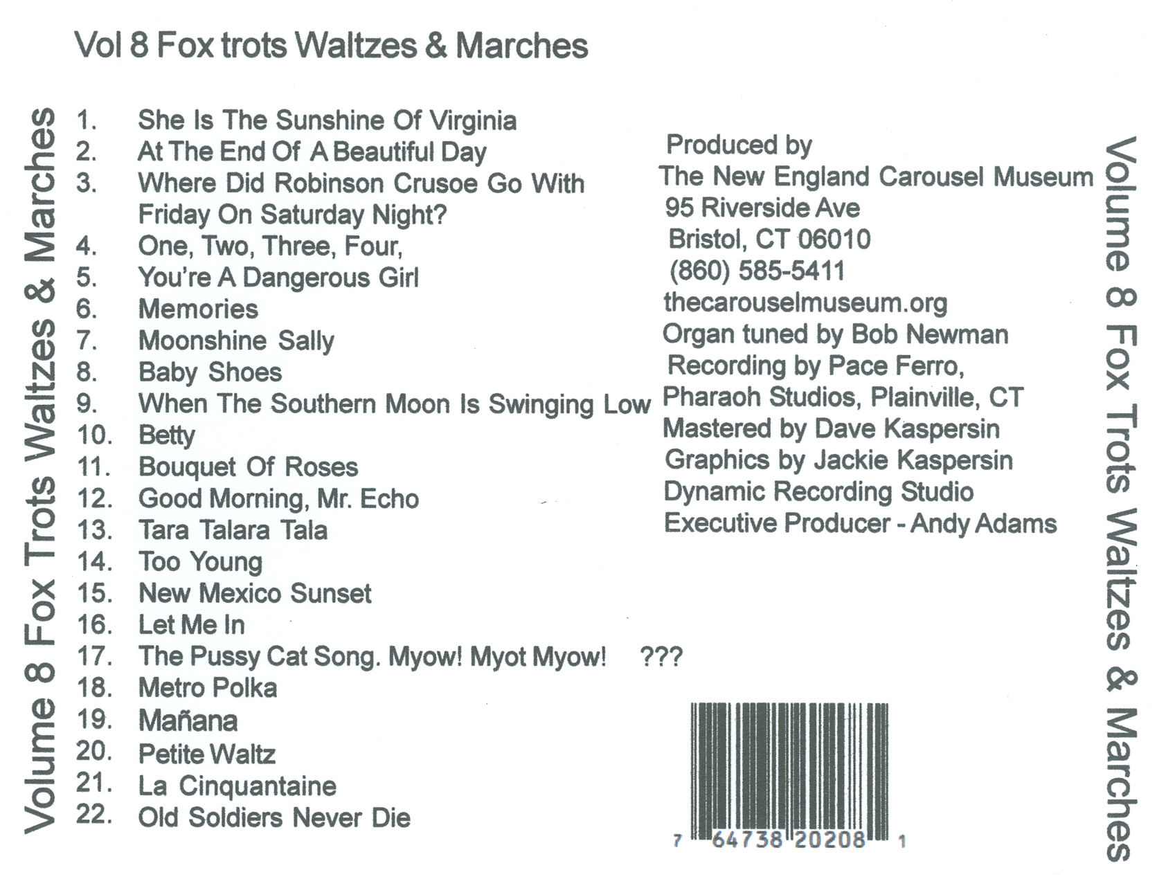 NOW AVAILABLE On Flash Drives - THE NEW ENGLAND CAROUSEL MUSEUM BAND ORGAN SERIES: VOL. 1 HOLIDAY TUNES. PLAYED ON A 1909 WURLITZER STYLE 105 BAND ORGAN. ![]() ![]() NOW AVAILABLE On Flash Drives - THE NEW ENGLAND CAROUSEL MUSEUM BAND ORGAN SERIES: VOL. 2 HOLIDAY TUNES. PLAYED ON A 1909 WURLITZER STYLE 105 BAND ORGAN. ![]() ![]() NOW AVAILABLE On Flash Drives - THE NEW ENGLAND CAROUSEL MUSEUM BAND ORGAN SERIES: VOL. 3 Big Band Swing and Marches. PLAYED ON A 1909 WURLITZER STYLE 105 BAND ORGAN. ![]() ![]() NOW AVAILABLE On Flash Drives THE NEW ENGLAND CAROUSEL MUSEUM BAND ORGAN SERIES: VOL. 4 HALLOWEEN TUNES. PLAYED ON A 1909 WURLITZER STYLE 105 BAND ORGAN. ![]() ![]() NOW AVAILABLE On Flash Drives THE NEW ENGLAND CAROUSEL MUSEUM BAND ORGAN SERIES: VOL.5 WALTZES, POLKAS, FOX TROTS, & MARCHES. PLAYED ON A 1909 WURLITZER STYLE 105 BAND ORGAN. ![]() ![]() Live Recording At The Museum Done By Pace Ferro, Pharaoh Stufios, Plainville, CT Organ Tuned by Bob Newman NOW AVAILABLE On Flash Drives - THE NEW ENGLAND CAROUSEL MUSEUM BAND ORGAN SERIES: VOL 6 Polkas and Marches. PLAYED ON A 1909 WURLITZER STYLE 105 BAND ORGAN. ![]() ![]() NOW AVAILABLE On Flash Drives THE NEW ENGLAND CAROUSEL MUSEUM BAND ORGAN SERIES: VOL.7 FOX TROTS, WALTZES, & MARCHES. PLAYED ON A 1909 WURLITZER STYLE 105 BAND ORGAN. ![]() ![]() Live Recording At The Museum Done By Pace Ferro, Pharaoh Stufios, Plainville, CT Organ Tuned by Bob Newman NOW AVAILABLE On Flash Drives THE NEW ENGLAND CAROUSEL MUSEUM BAND ORGAN SERIES: VOL.8 ONE STEP, WALTZES, & FOX TROTS. PLAYED ON A 1909 WURLITZER STYLE 105 BAND ORGAN. ![]() ![]() < You can order right here on our site and pay with PayPal you don't need to be a PayPal Member to pay for the order at all.